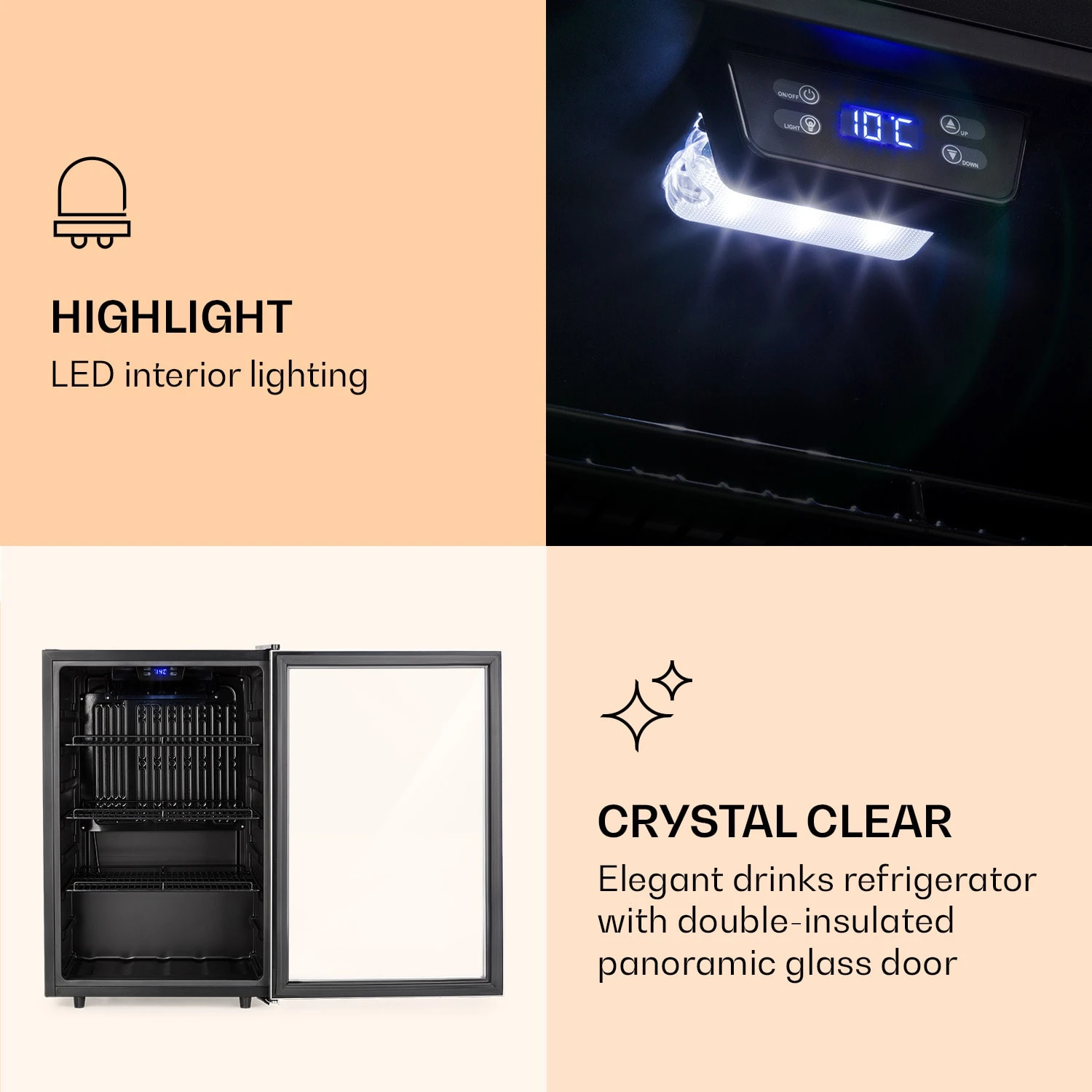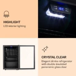 Drei Metall-Gitterböden bieten viel Platz für Speisen und Getränke. Die doppelt isolierte Panoramaglastür hält die Kälte drinnen und die Wärme draußen. Die Front aus gebürstetem Edelstahl bildet einen guten Kontrast zur schwarzen Innenausstattung. Ein zusätzliches Highlight ist die LED-Innenbeleuchtung, die dem Beersafe 5XL den letzten Schliff verleiht. Die Kühltemperatur kann bequem über ein Bedienfeld mit Digitalanzeige eingestellt werden.