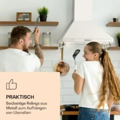 Die edle Klarstein Victoria 60 Retro-Dunstabzugshaube entfernt unverzüglich Essensgerüche und Dämpfe aus kleinen bis mittleren Küchen. Die Dunstabzugshaube mit dekorativen Retro-Elementen kann für unterschiedlich starke Kochaktivitäten mit 3 unterschiedlichen Leistungsstufen mit max. 644,5 m³/h Luftdurchsatz betrieben werden. Dank der zuschaltbaren Beleuchtung hast du das Kochfeld dabei gut im Blick. Praktisch und schön anzusehen sind auch die seitlichen Relinge zur Aufhängung von Küchenutensilien und die dekorativen Knöpfe.